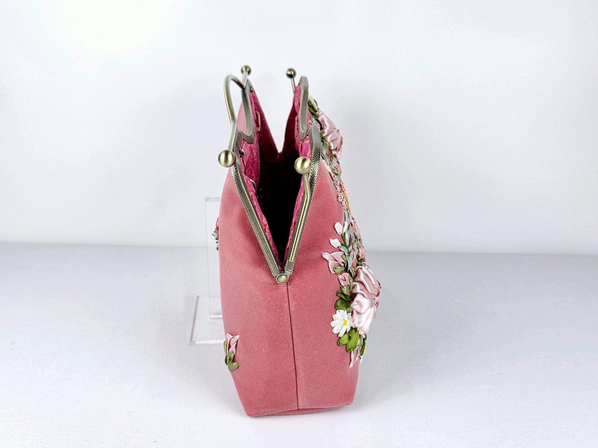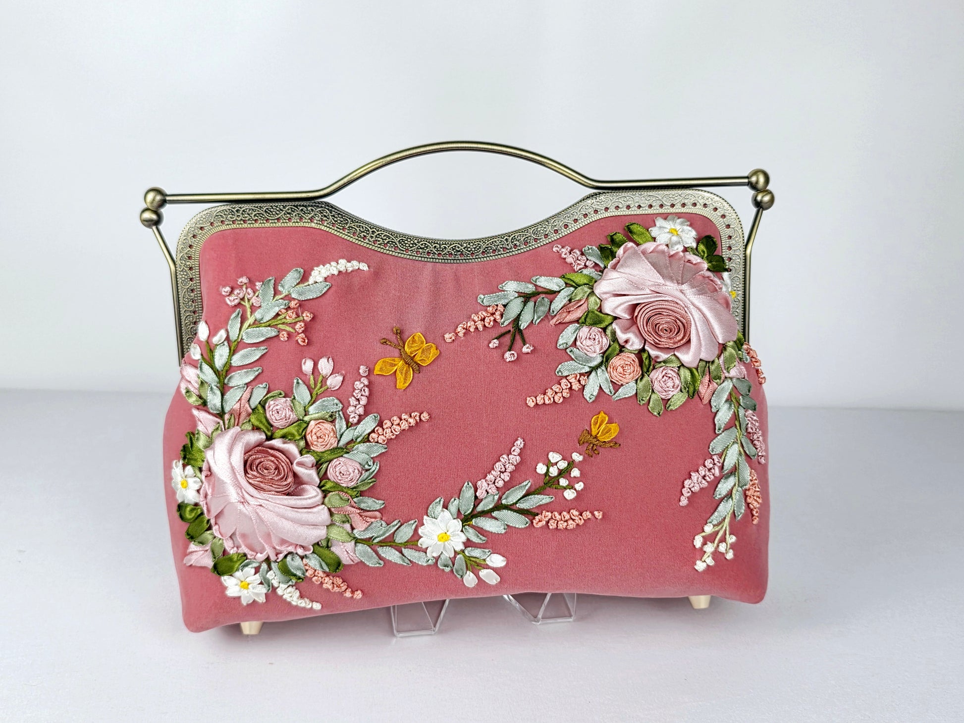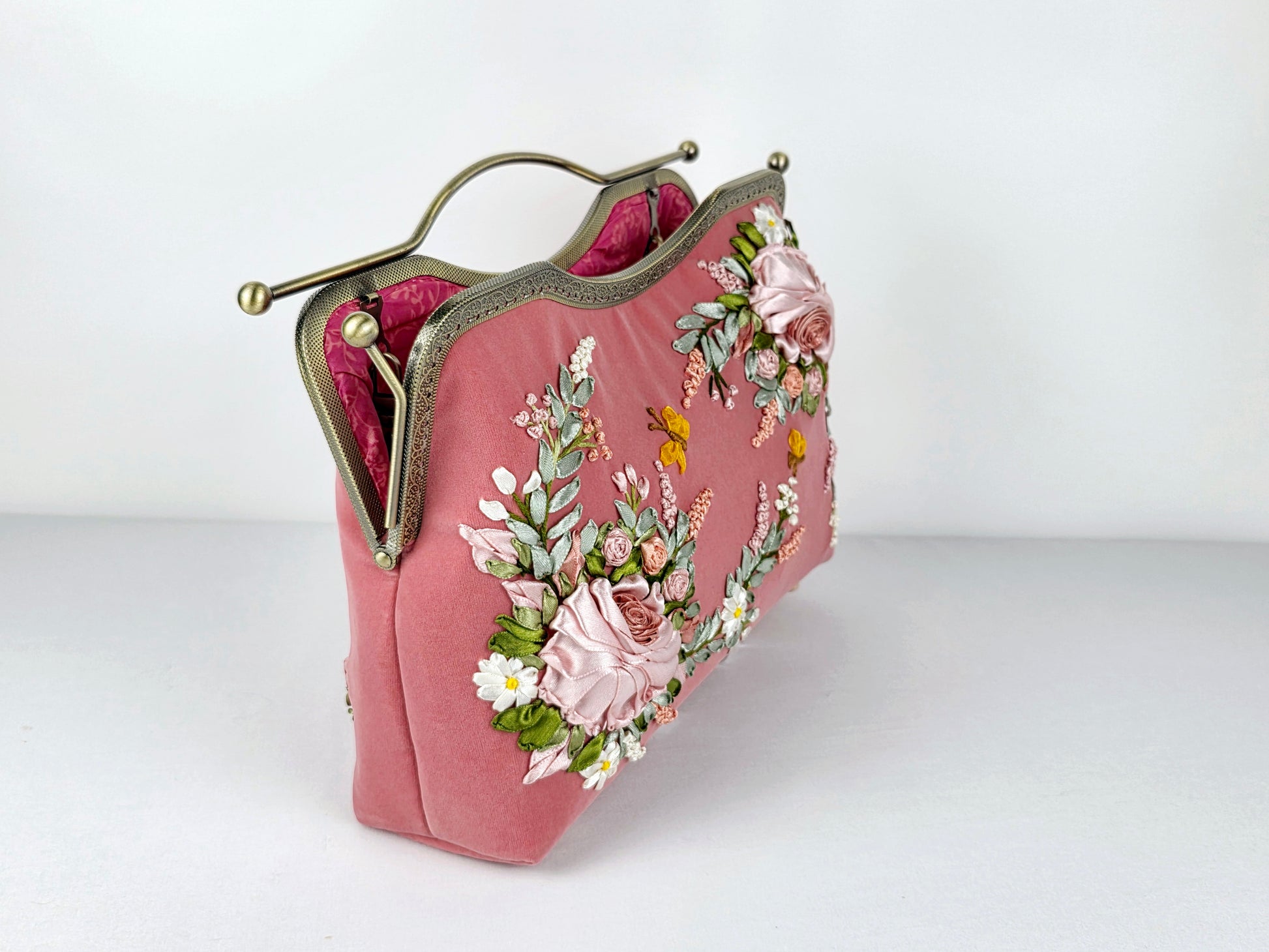 Our top-selling clutches are meticulously crafted from the ground up. The ribbon is hand-embroidered directly onto smooth, high-quality velvet, which is then carefully cut to shape. The soft sole is precisely trimmed, and all components are assembled within a sturdy metal frame. Inside, the clutch includes one open pocket and one zippered pocket for organized storage. Each piece comes with a detachable metal chain, allowing it to be worn crossbody or carried as a clutch. Featuring a unique blend of clutch color and floral embroidery, the ribbon design creates a striking contrast against the velvet. Its large size offers versatility for both special occasions and everyday use.